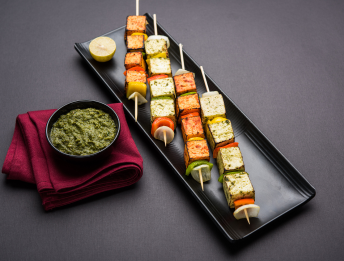 Flavored rice, spicy curry, grilled chicken kebabs.